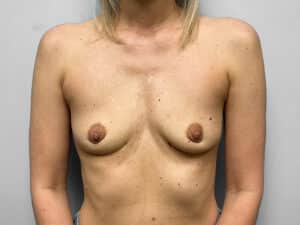 This woman in her early fifties desired a breast implant exchange to a slightly larger size. She had a previous augmentation from another provider from an A cup to a C/D cup with saline implants. Dr. Howell performed her surgery with smooth, round, silicone implants and she has nice shape, position, and symmetry. She is shown before and three months afterwards.